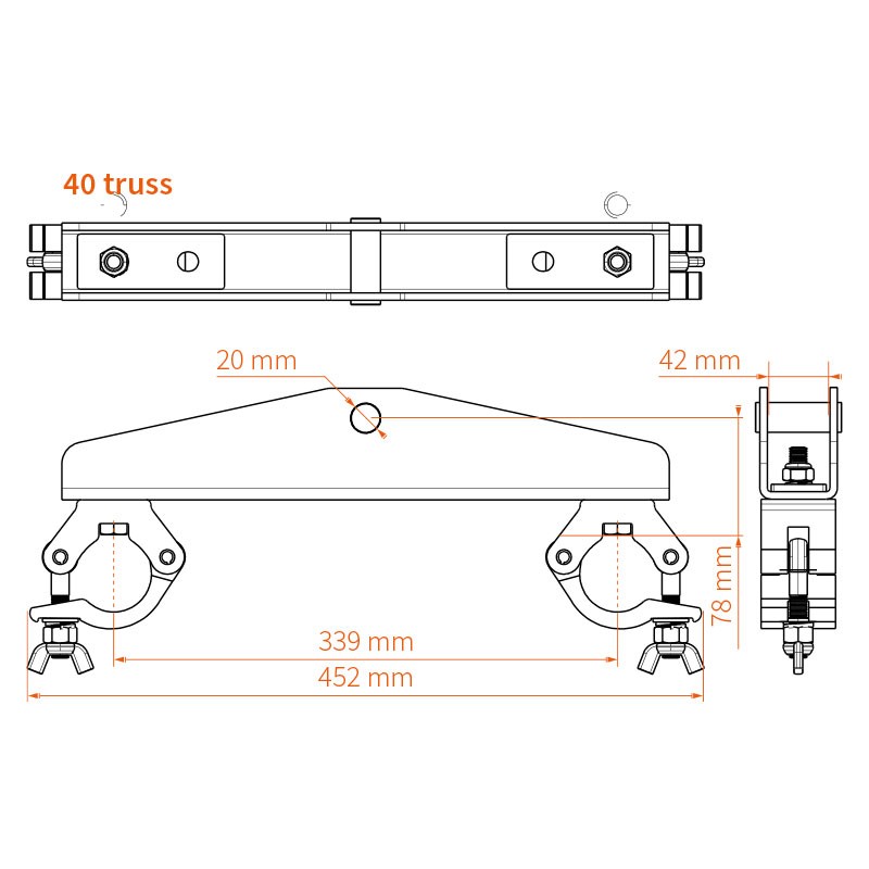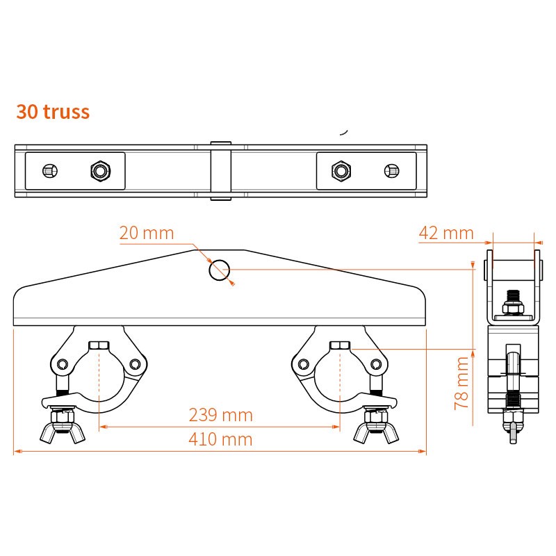 Soporte de truss 30 con media abrazadera 500kgEl soporte Truss 30 con media abradera es compatible con truss que tienen una distancia de centro a centro de 239 mm (30 truss), incluyendo Prolyte, SIXTY82, Eurotruss, Global Truss, NEXT Truss, Contestage y LITEC