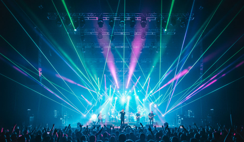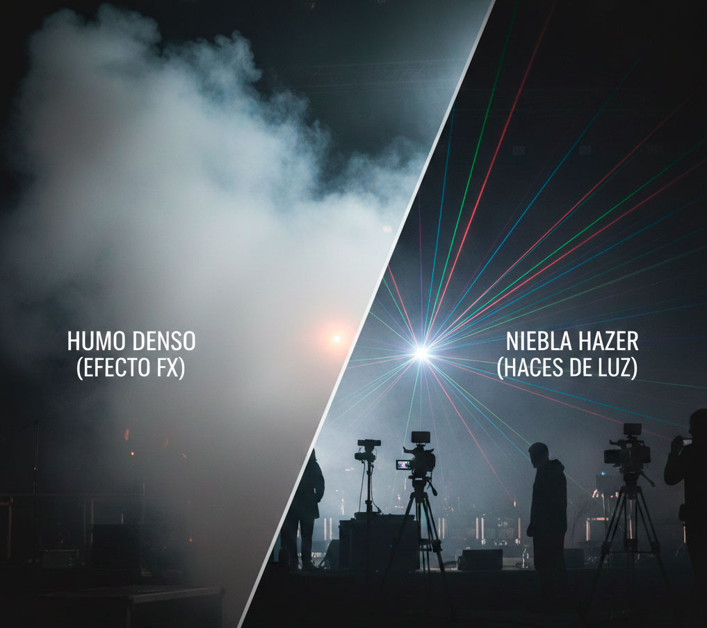 Máquina de Niebla (Hazer): Crea una bruma casi invisible al ojo directo, pero muy eficaz para refractar la luz. Su objetivo es que el espectador vea los rayos de los focos (Beam), no la nube de humo.