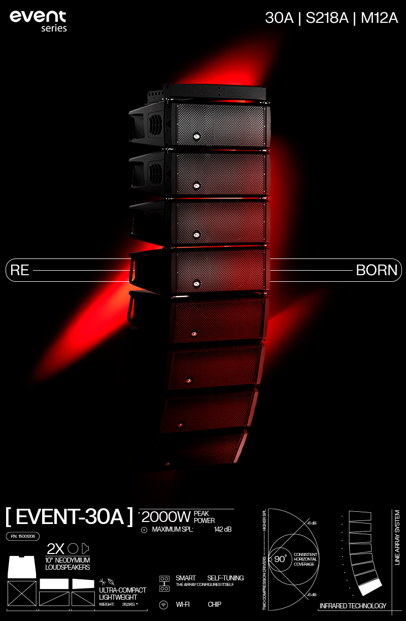 Diseñado y fabricado en nuestra sede central de Valencia, España, el EVENT-30A combina dos woofers de neodimio de 10 pulgadas con dos drivers de compresión, aumentando el rango dinámico, mejorando el control de los medios-graves y ofreciendo un mayor SPL útil (hasta 142 dB), especialmente en configuraciones de mayor tamaño. |