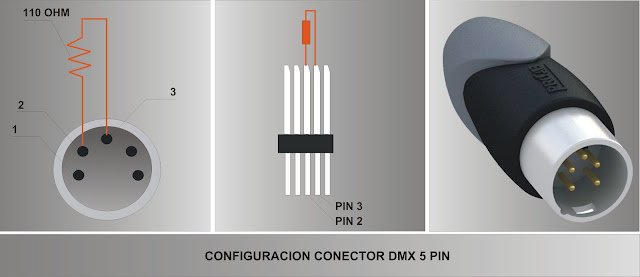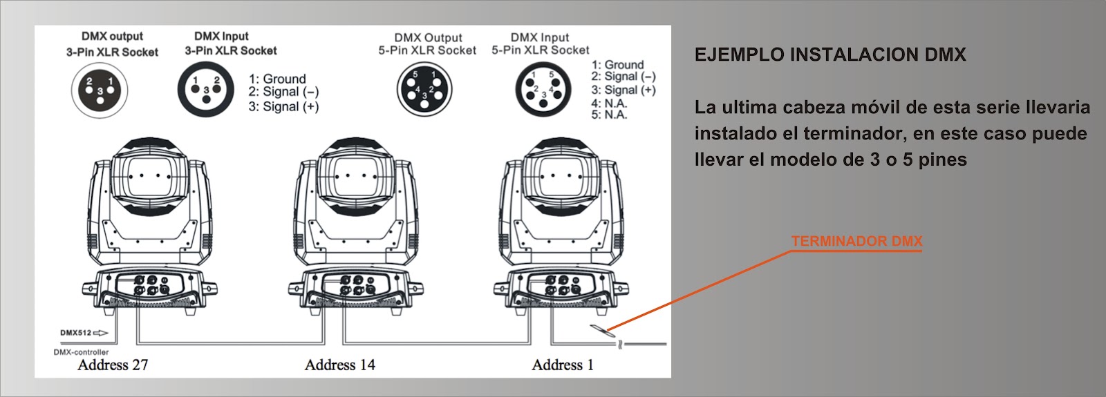 terminador de señal DMX” que se trata de una resistencia de 110 ohm que cierra el circuito. Para instalaciones donde el
