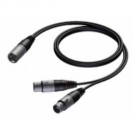 Cable señal audio con 1 XLR macho de 3 pin a 2 XLR hembra de 3 pin, de 1,5 mCubierta exterior de PVC flexible Conductores trenzados delgados y densos de 25 AWG 4 x 8 mm (Ø) de diámetro exterior Blindaje espiral Cobre libre de oxígeno