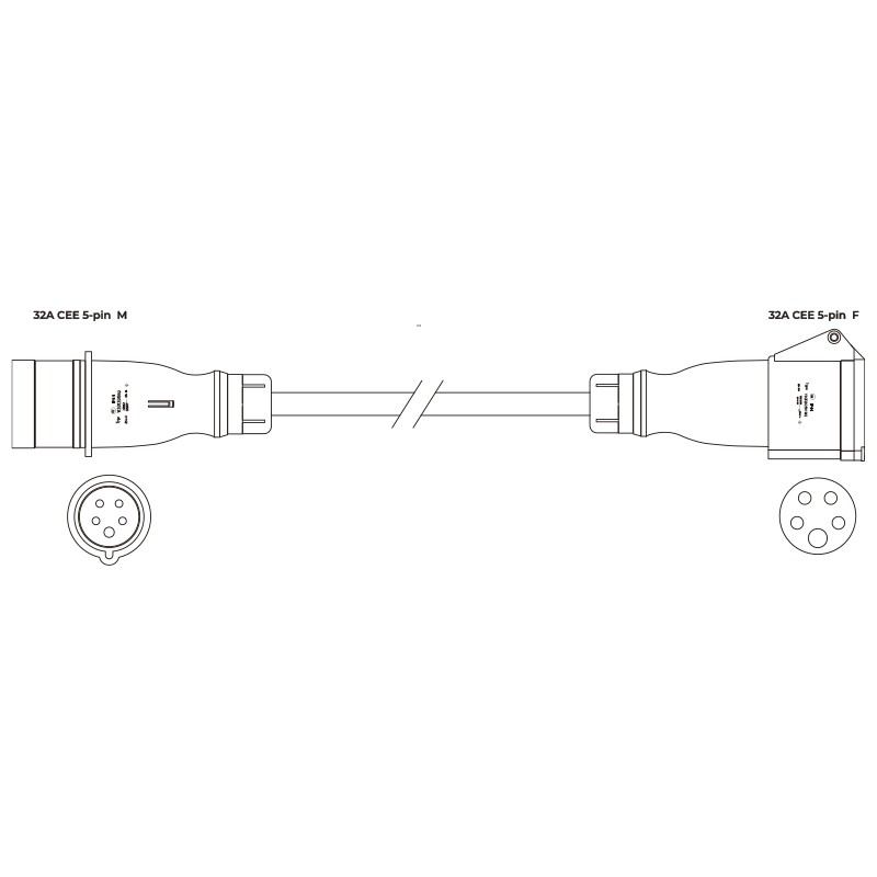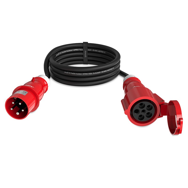 Cable alargador CEE 32A 5 polos macho a CEE 32A 5 polos hembra de 5 m. |AUDIBAX CEE500-60-5PCables trifásicos de 32A y 450/750V con AWG 10 fabricados con cable H07RN-F y equipados con tomas de corriente CEE 5 pines Cable H07RN-F 5G6 de 6 mm² con revestimiento de goma resistente 32A Macho a 32A hembra Longitud: 5 m