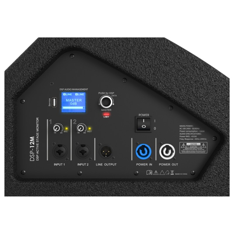 El Audibax Pro DSP12M es un monitor de escenario coaxial activo de 12'' con driver de titanio de 1.75'', diseñado para ofrecer sonido claro y potente en entornos profesionales. Incorpora procesamiento DSP con presets, EQ y crossover, y alcanza 400W RMS (800W pico) con un SPL máximo de 124 dB, la configuración coaxial de este monitor permite una emisión de fase coherente desde un único punto, optimizando la dispersión uniforme del sonido, y minimizando la retroalimentación en aplicaciones en vivo y favorece un diseño compacto sin pérdida de rendimiento acústico.