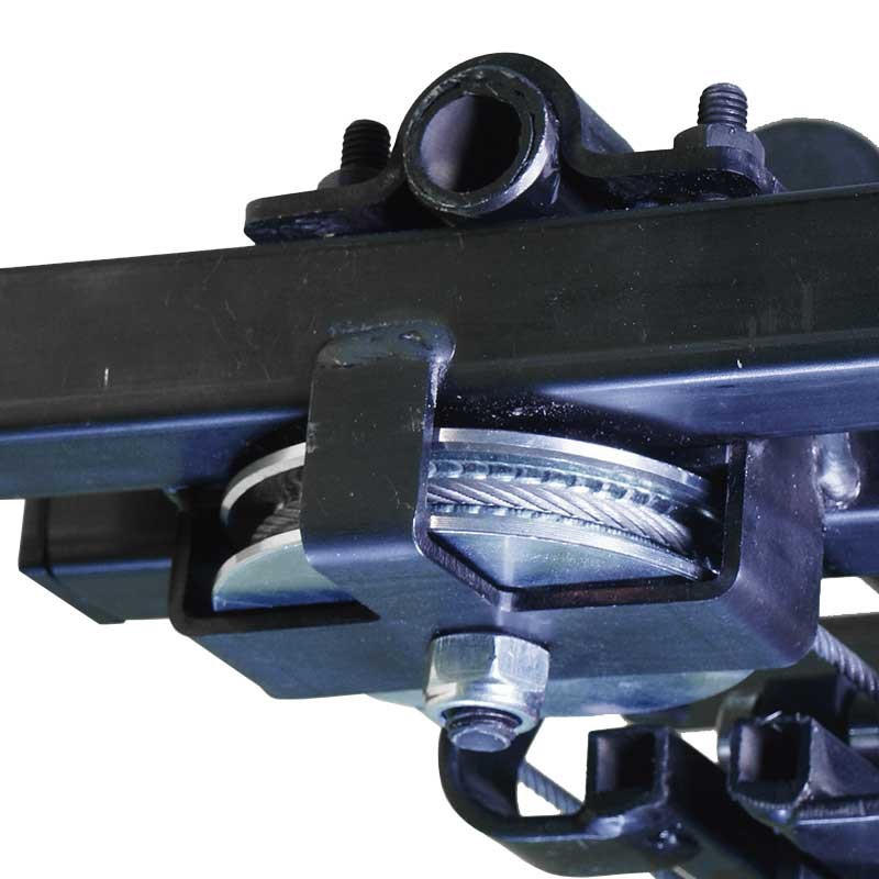 Polea de tiro doble para carril de acero con apertura mediante cuerda Esta polea también llamada de desembarco se pone en el extremo del carril para el paso de cuerda, por un lado va hacia el otro extremo del carril y por el otro baja hasta la polea de tensión manual que se instala en el suelo