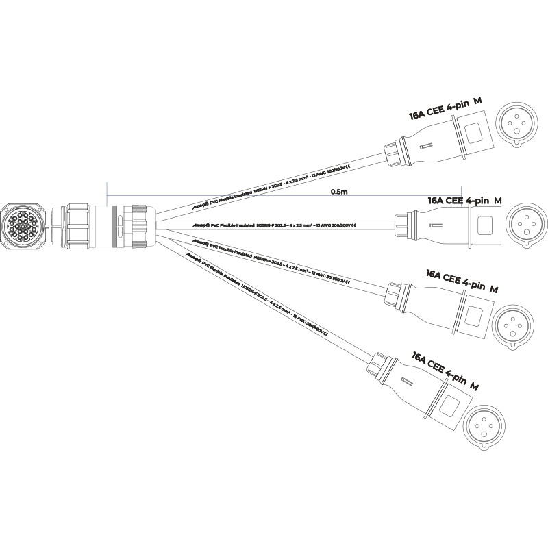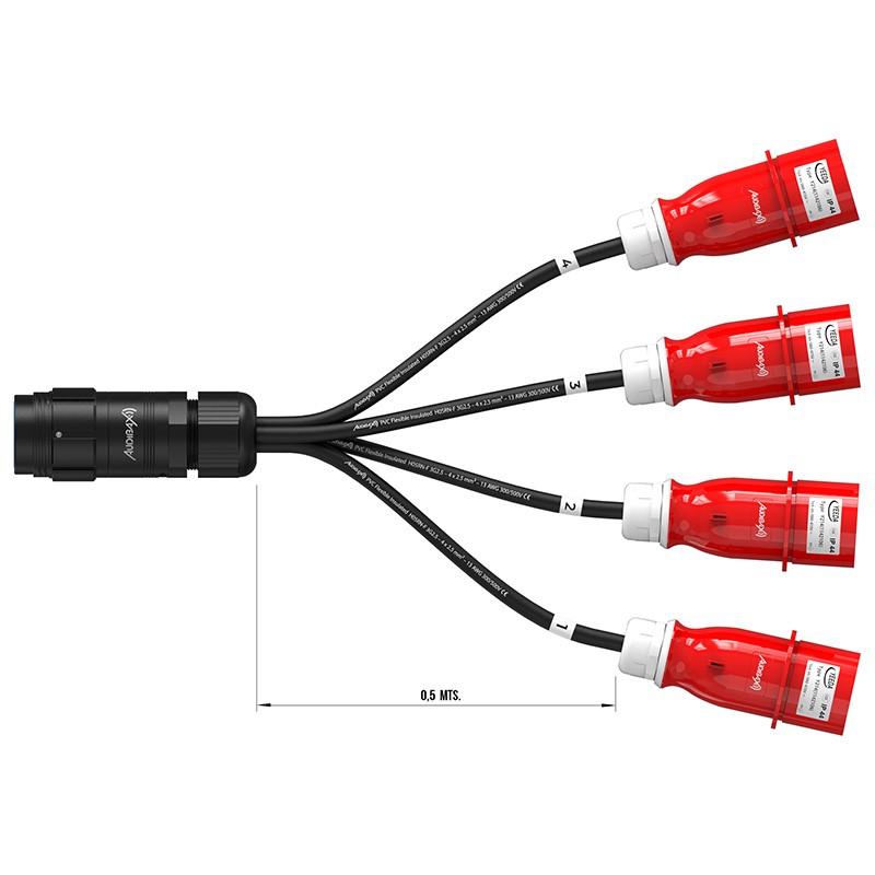Cable adaptador de 1 Socapex 19 Pin macho a 4 CEE 16A 4 Polos hembra de 0,5 m | Audibax A-SCP-M-4CEE4P-F-25Perfecto para cableado de motores de cadena 1 Entrada Socapex a 4 salidas CEE mediante cable de 4 x 2,5 mm² El conector Socapex es compatible con Amphenol Socapex SL419