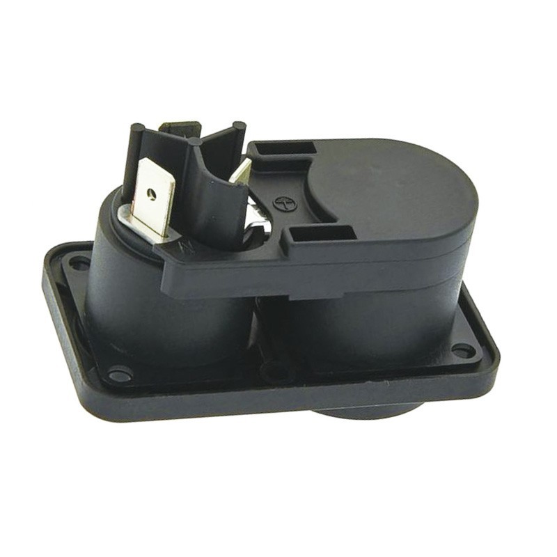 Conector chasis Powercon color gris de 2 contactos + tierraEste conector cumple totalmente con el estándar Conector de salida, terminales de lengüeta plana Conector monofásico bloqueable Muy utilizado para alimentación de equipos de iluminación, audio, pantallas LED, proyectores, etc.