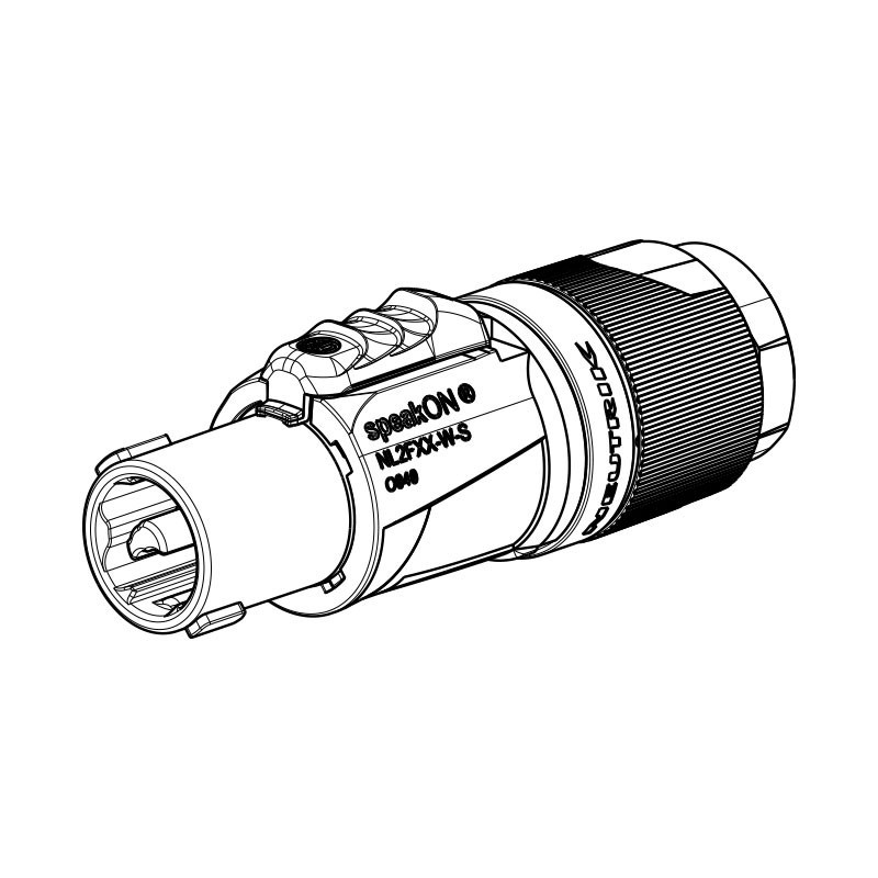 Conector speaKON aereo de 4 polos NL4FXX-W-S Neutrik para cables de 6 mm a 12 mmClasificación de corriente de hasta 37 A rms Exclusivo buje de bloqueo Neutrik y alivio de tensión para diámetros de cable de 6 mm a 12 mm