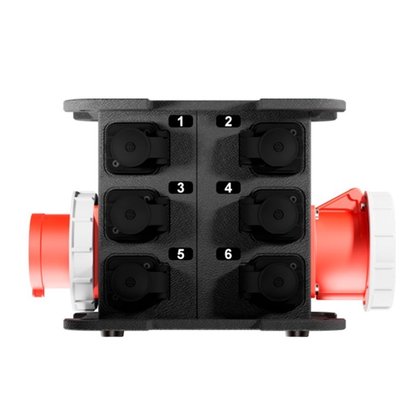 Cajetín con 1 harting 16 Pin entrada y 6 x schuko salida. Contrik CPSM-H1-F6Reducción del volumen y esfuerzo del cableado gracias a la entrada multipin Harting E16 Alta protección mecánica : Carcasa resistente Easylen con alto IK, protección completa del conector con elementos de carcasa Protección Xtreme Outdoor: IP65 con Harting E16 en condición...