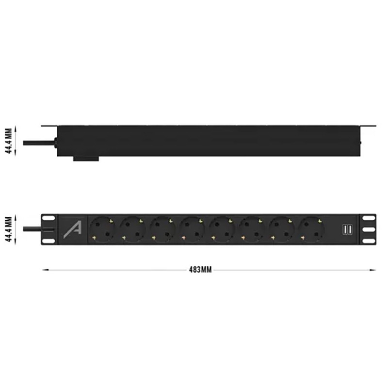 Regleta 8 Tomas Schuko formato Rack 19" 1U | Audibax PSR8-SBPotencia maxima 3.680 W. Longitud del cable: 1,8 m 8 enchufes tipo Schuco de 16A. Cuerpo de aluminio. Altura de rack 1U. Cable de alimentación H05VVF de 3x1,5mm² y de 1,8 metros de longitud, con conector schuco de 16A Cumple la normativa 89/366/EEC - 73/23/ECC - 93/68/EEC con estándares norma...