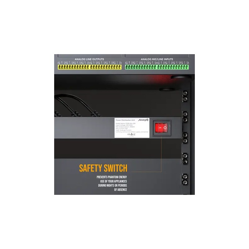 Base 8 Schuko formato Rack 19" 1U con Interruptor On/Off | Audibax PSR8-PwCPotencia maxima 3.680 W. Longitud del cable: 1,8 m Entrada de alimentación mediante conector powerCON 8 enchufes tipo Schuko de 16A. Interruptor On/Off en el frente Cuerpo de aluminio Altura de rack 1U. Cable de alimentación H05VVF de 3x1,5mm² y de 1,8 metros de longitud, con...
