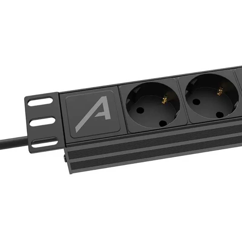 Regleta 8 Tomas Schuko para Armario Rack 19" 1U con Interruptor On/Off | Audibax PSR8-SFPotencia maxima 3.680 W. Longitud del cable: 1,8 m 8 enchufes tipo Schuco de 16A. Interruptor On/Off delantero Cuerpo de aluminio. Altura de rack 1U. Cable de alimentación H05VVF de 3x1,5mm² y de 1,8 metros de longitud, con conector schuco de 16A Cumple la normativa...
