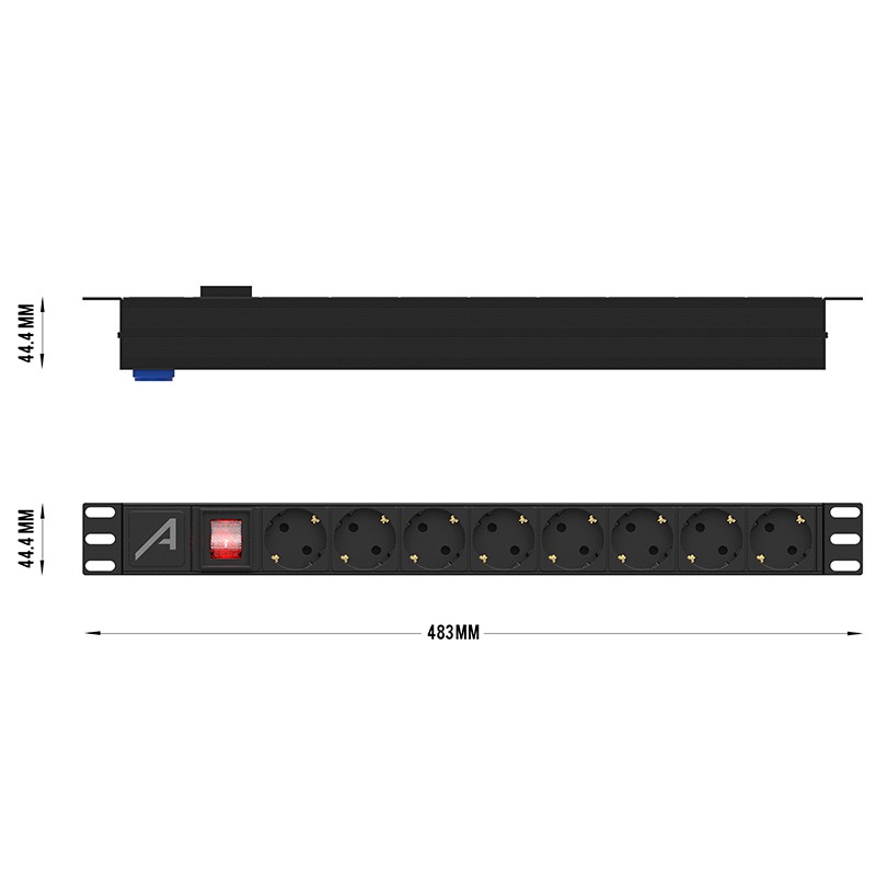 Regleta 8 Tomas Schuko formato Rack 19" 1U | Audibax PSR8-SBPotencia maxima 3.680 W. Longitud del cable: 1,8 m 8 enchufes tipo Schuco de 16A. Cuerpo de aluminio. Altura de rack 1U. Cable de alimentación H05VVF de 3x1,5mm² y de 1,8 metros de longitud, con conector schuco de 16A Cumple la normativa 89/366/EEC - 73/23/ECC - 93/68/EEC con estándares norma...
