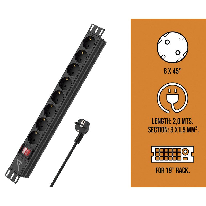 Base con 8 enchufes schuco SIN interruptor luminoso formato rack 19"Potencia maxima 3.500 W. 8 enchufes tipo Schuco de 16A. Cuerpo de aluminio. Altura de rack 1U. Cable de alimentación H05VVF de 3x1,5mm2 y de 2 metros de longitud, con conector schuco de 16A Cumple la normativa 89/366/EEC - 73/23/ECC - 93/68/EEC con estándares norma EN60947-1:2004....