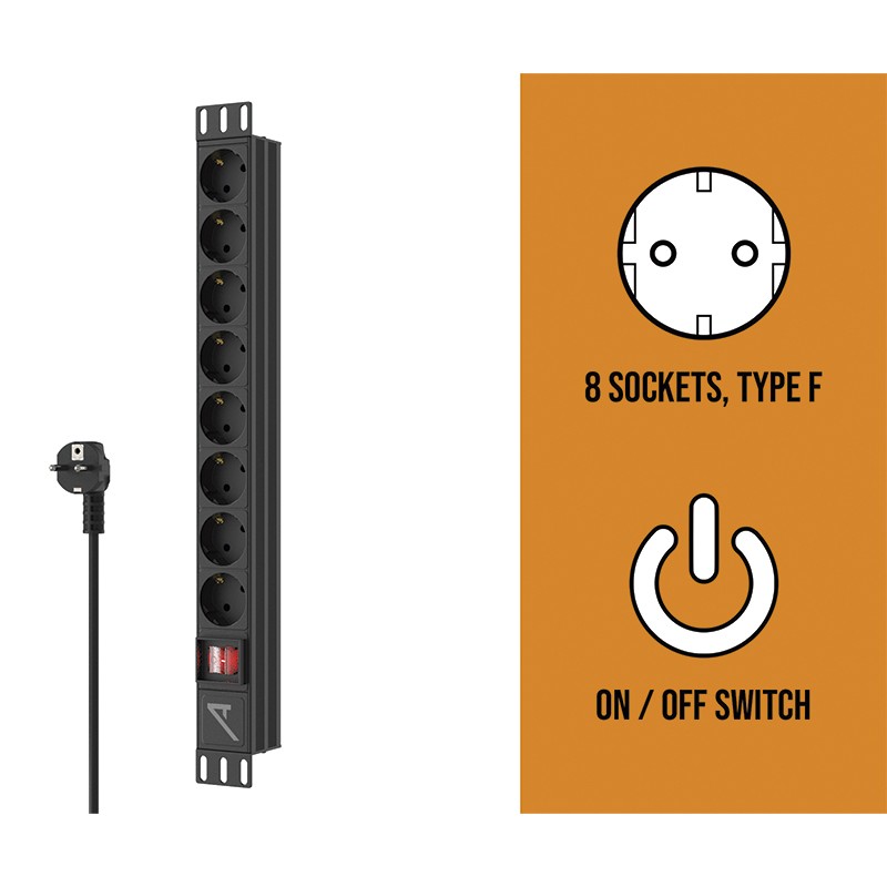 Regleta 8 Tomas Schuko para Armario Rack 19" 1U con Interruptor On/Off | Audibax PSR8-SFPotencia maxima 3.680 W. Longitud del cable: 1,8 m 8 enchufes tipo Schuco de 16A. Interruptor On/Off delantero Cuerpo de aluminio. Altura de rack 1U. Cable de alimentación H05VVF de 3x1,5mm² y de 1,8 metros de longitud, con conector schuco de 16A Cumple la normativa...