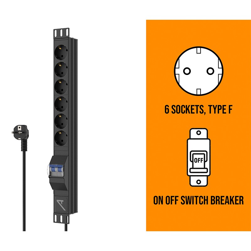 Base con 6 enchufes schuco y magnetotermico de 16A formato rack 19"Potencia maxima 3.500 W. Magnetotérmico Bipolar 16A. 6 enchufes tipo Schuco de 16A. Cuerpo de aluminio. Altura de rack 1U. Cable de alimentación H05VVF de 3x1,5mm2 y de 2 metros de longitud, con conector schuco de 16A Cumple la normativa 89/366/EEC - 73/23/ECC - 93/68/EEC con estándares...