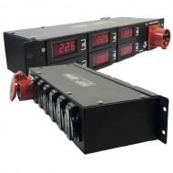 Distribuidor de energia PD-32SH, montado en caja metálica formato rack 19" en 3 unidades de alturaInterruptor magneto-termico de corte general Interruptor diferencial de corte general 6 Magneto-termicos de corte individual de salidas Voltimetro y amperimetro por fase Acometida CEE Salida mediante socapex, harting y conectores Schuko