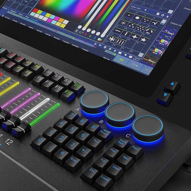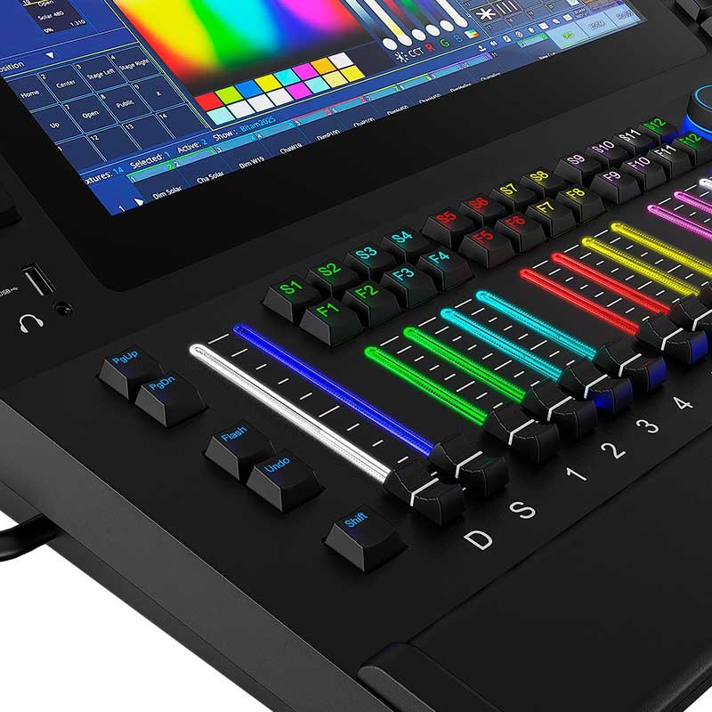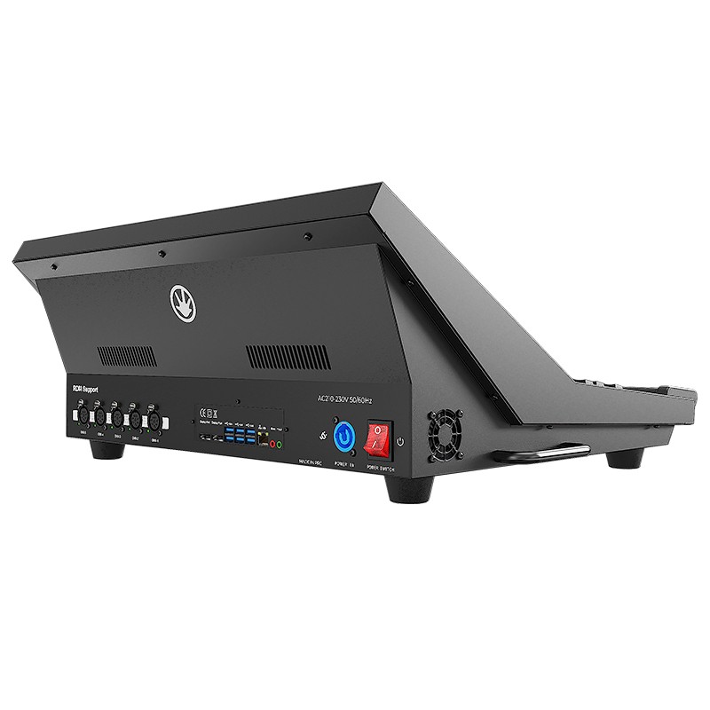 Triton Blue Atlas 1024 Mesa DMX Funda IncluidaTipo de control: DMX Canales DMX: 2 × 512 Protocolos compatibles: DMX, RDM, Art-Net y sACN Universos: 4 Conectividad: 2x 5-pin Salida DMX , aislamiento óptico, puerto LAN, 2x Puertos USB, 3.5mm Salida de audio Jack Panel de control: Pantalla táctil con retroiluminación RGB programable en las teclas, 2...