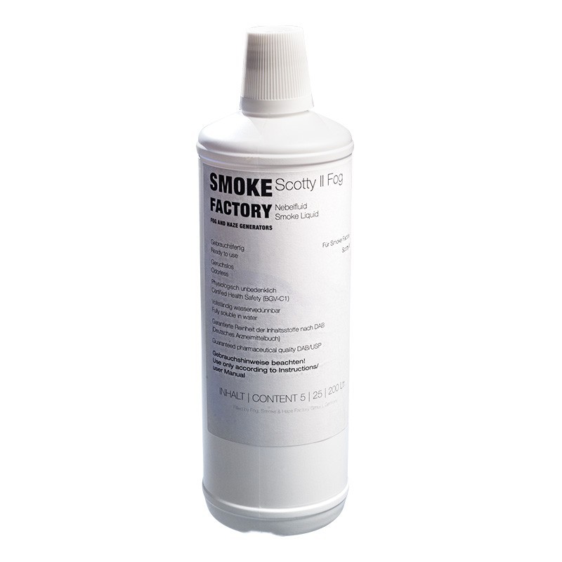 Bote de 250 ml liquido de humo para Scotty II de Smoke FactoryLíquido especial para la máquina de niebla Scotty II a batería. Debido al evaporador extremadamente pequeño, es extremadamente importante usar solo el fluido Scotty II de alta calidad, esta es la única forma de evitar daños a corto plazo en el evaporador. Fluidos a base de agua, libres de...