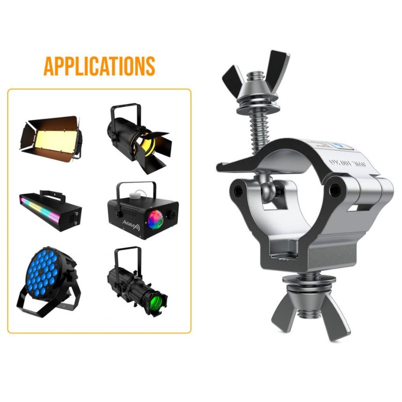 Abrazadera de aluminio para tubo de 48 a 52 mm, para 75Kg color plataAbrazadera de aluminio para ser fijada a estructuras de iluminación, escenografías de teatro, instalaciones eventuales o permanentes. Se utiliza para fijas proyectores y efectos de iluminación, cámaras de video, cajas acústicas y otros elementos dentro del escenario o en otros sectores.