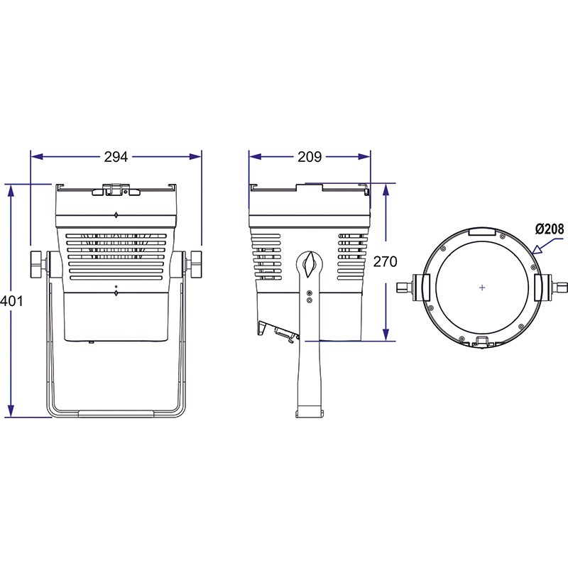 LED BLINDER, Cegadora LED equipada con dos proyectores LED COB blancos de 100W 2 LED COB de 100W (3200K) Ambos proyectores pueden ser controlados individualmente Regulación del 0% al 100%. Ángulo de haz: 60° Temperatura de color: 3200K