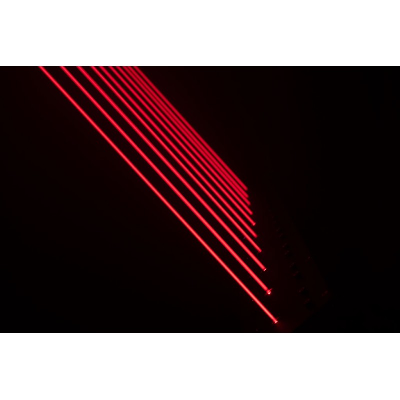 Crea abanicos de rayos láser y puede controlarse mediante DMX o funcionar en modo independiente o con música. El Laserworld BeamBar 10RGB es una barra con 10 salidas láser de un solo haz, cada una equipada con un diodo láser rojo de 120 mW / 650 nm, uno verde de 50 mW / 520 nm y uno azul de 80 mW / 450 nm, lo que permite crear millones de colores y blanco.