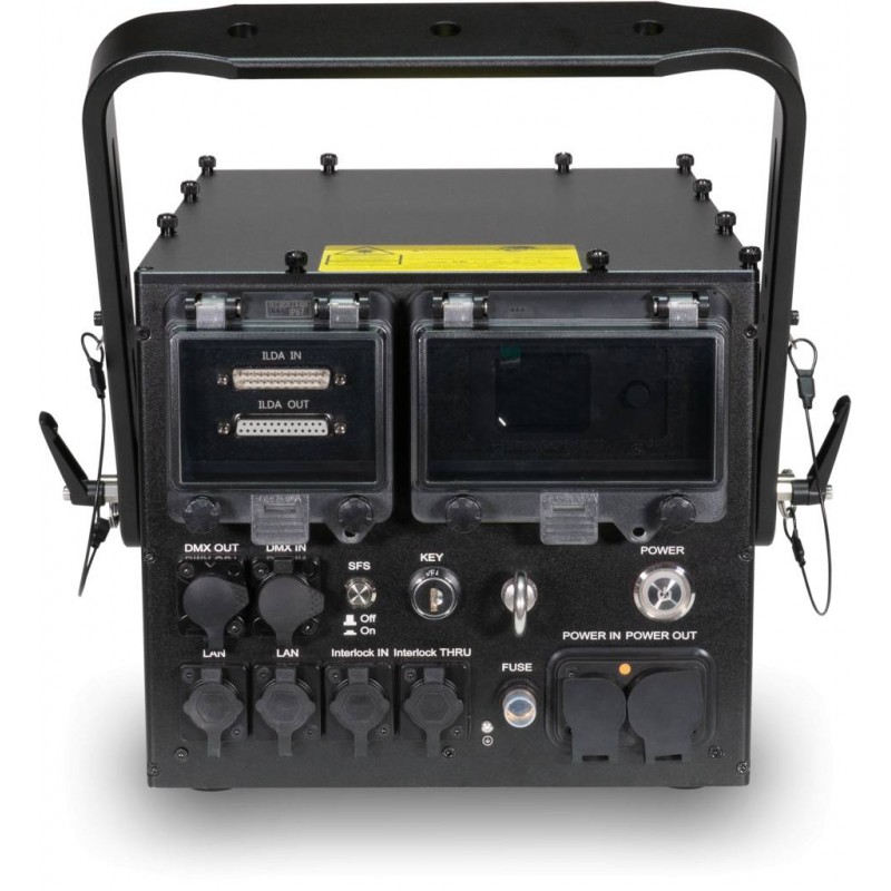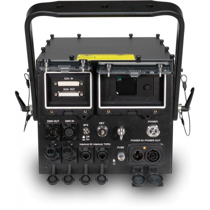 Laserworld PL-70.000RGB IP65 Un láser a todo color de muy alta potencia con controladora múltiple incorporada. Asombroso control DMX con ajustes de seguridad internos que facilitan el control de múltiples unidades junto con el resto de su iluminación DMX. ¡Licencia de software de espectáculo láser de características completas incluida! Sección óptica...
