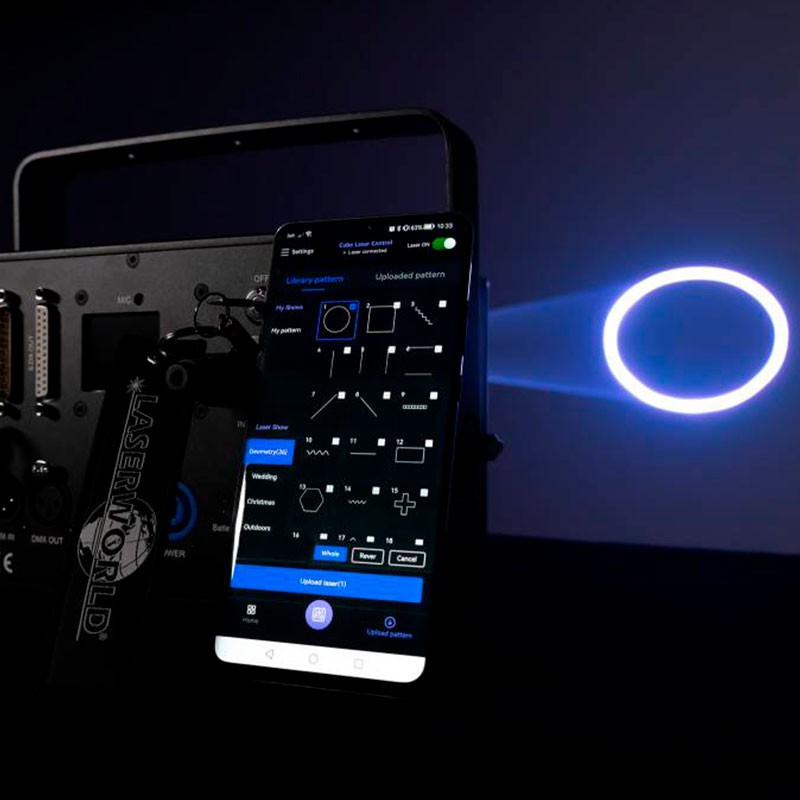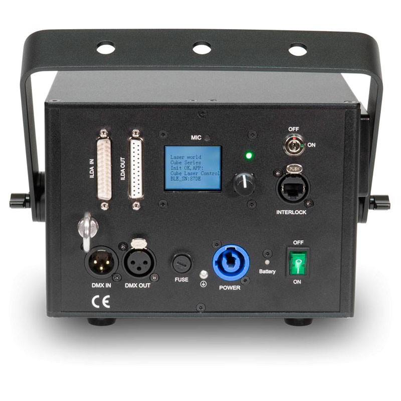 Laser CUBE 7 Laserworld 7WControlable mediante aplicación móvil Batería integrada (6400 mAh) Potencia típica de 7'000 mW Sistema láser solo con diodos Controlable por ordenador mediante ILDA Modo sonido-luz y modo autónomo Controlable por DMX, posibilidad de funcionamiento maestro-esclavo