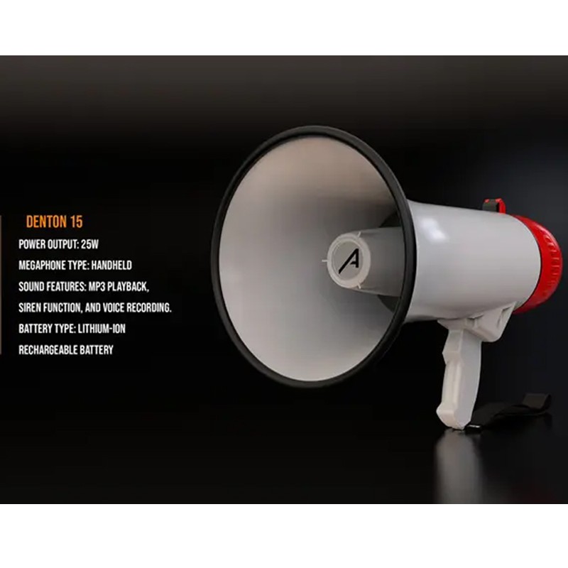 Este megáfono va más allá del simple amplificador de voz. Cuenta con funciones de reproducción de MP3 para añadir música a tus presentaciones, una función de sirena para llamar la atención y la capacidad de grabar tu voz para reproducción posterior, brindándote un control completo sobre tu sonido. Equipado con una batería de iones de litio recargable, el Denton 15 te permite hablar sin preocuparte por el agotamiento de la batería. Una carga completa te brinda un tiempo de funcionamiento confiable para todas tus necesidades de amplificación de voz.