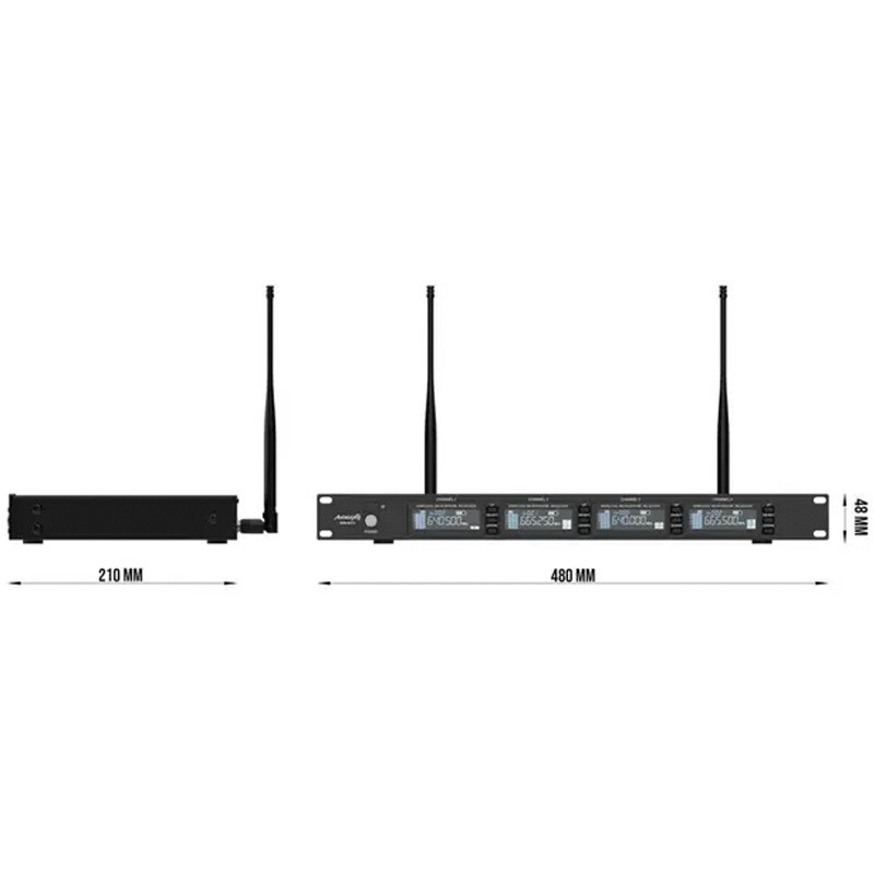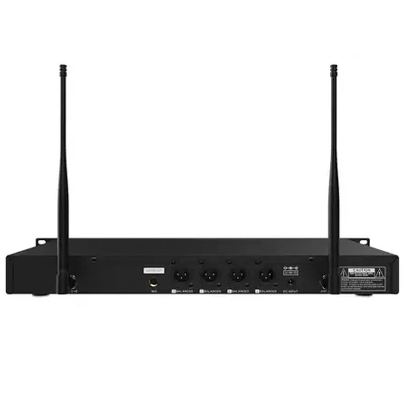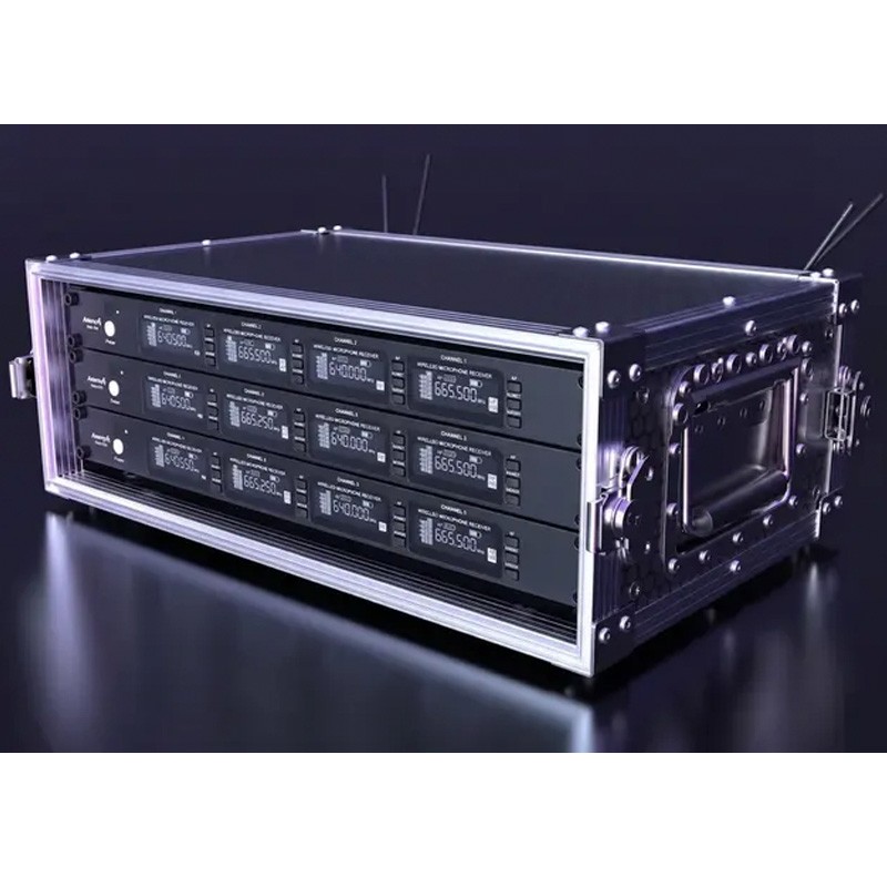 Cuenta con salidas XLR y Jack 6,3 mm, sincronización IR, respuesta en frecuencia de 50 Hz–15 kHz y una relación señal/ruido de 100 dB, garantizando una transmisión limpia y fiable. Su chasis metálico en formato rack 19” lo convierte en una solución robusta y profesional.