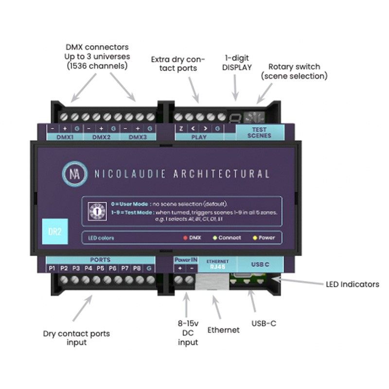 DINA-DR2 controlador de iluminación para montar en carril DIN. NicolaudieEl DINA-DR2 es la última solución para el control de la iluminación de Nicolaudie Architectural. Nicolaudie a diseñado este controlador todo en uno, con varios protocolos de salida, capacidad de disparo e integración, memoria programable para secuencias dinámicas de iluminación,...