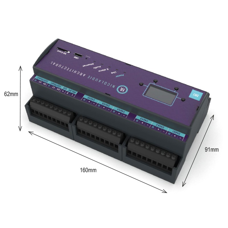 DINA-DR2-LITE controlador de iluminación para montar en carril DIN. NicolaudieCon 512 canales DMX y basado en el DINA-DR2, el DINA-DR2 LITE es una solución muy asequible para beneficiarse de las nuevas capacidades del motor independiente.