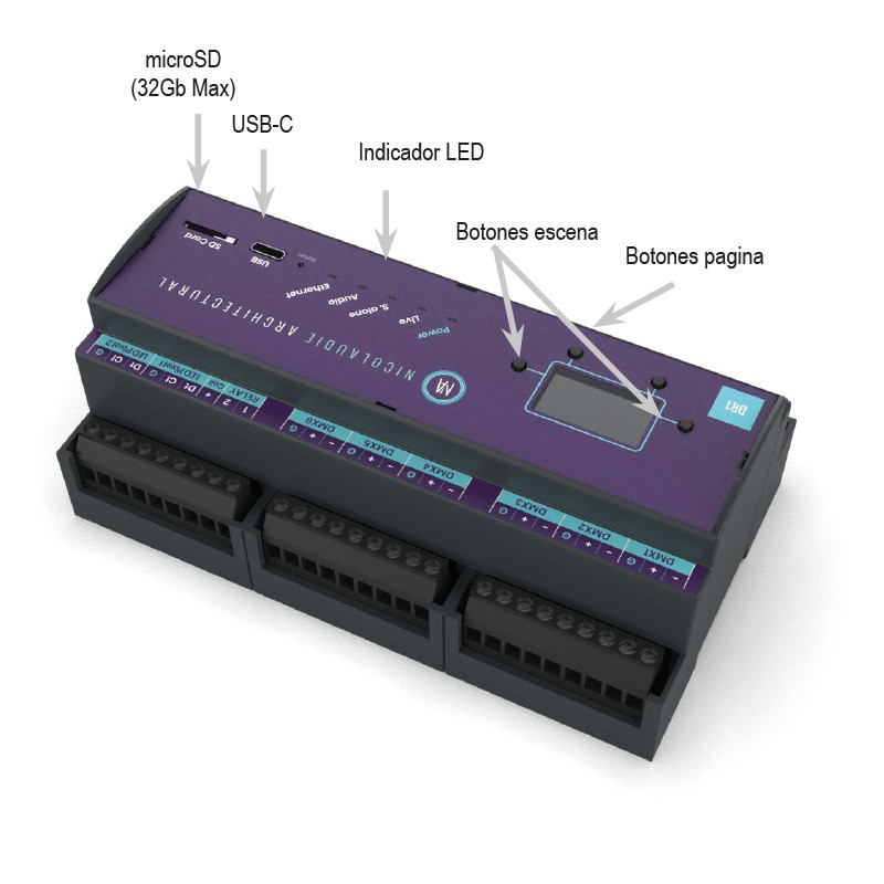 Interface USB a DMX DINA-DR-MICRO Nicolaudie ArquitecturaInterface USB a DMX. Función Standalone. 60 ch DMX. 2 triggers. Hasta 99 escenas. Capacidad 8 KB. Puede programarse desde PC / MAC. Gestión vía ESA2. Controlable desde Acrolis APP. No incluye PC.