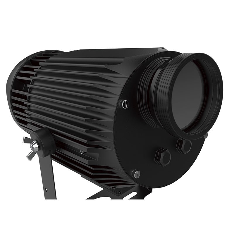 Proyector LED de gobos rotativos de 200W IP65 Triton-Blue PG200R1IP con lente 1:0.25 El proyector ideal para instalaciones exteriores comerciales donde se necesita la precisa proyección de gobos con imágenes en alta calidad.Proyector de gobos de 200W con LED OSRAM IP65 Fácil cambio de gobo, admite gobos de vidrio o metal Grupo óptico de alta calidad...