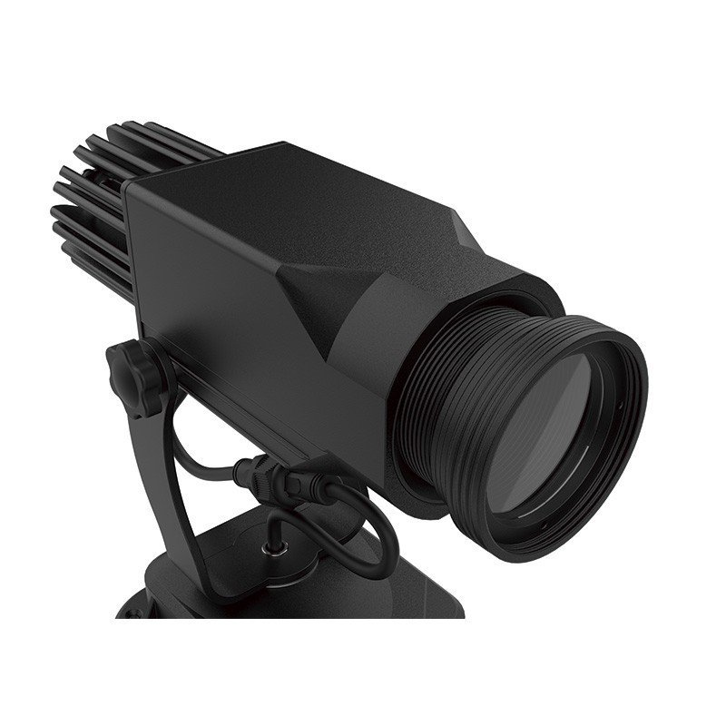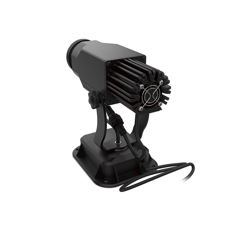 Proyector LED de gobos rotativos de 300W IP65 Triton-Blue con lente 1:0.25 El proyector ideal para instalaciones exteriores comerciales donde se necesita la precisa proyección de gobos con imágenes en alta calidad y gran potenciaProyector de gobos de 300W con LED OSRAM IP65 Fácil cambio de gobo, admite gobos de vidrio o metal Grupo óptico de alta...