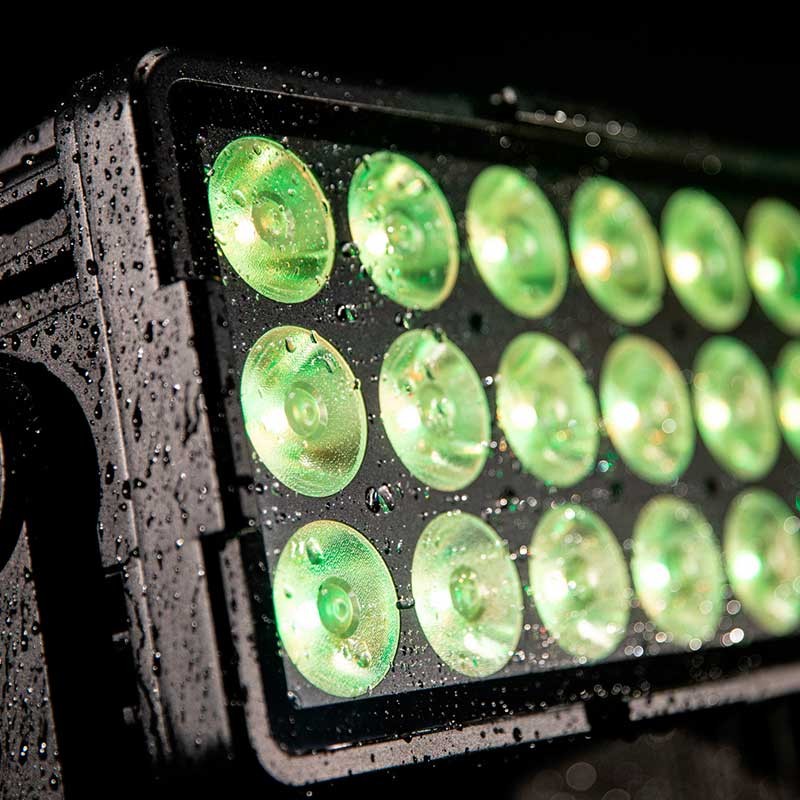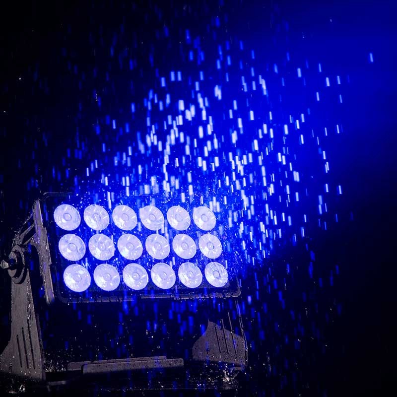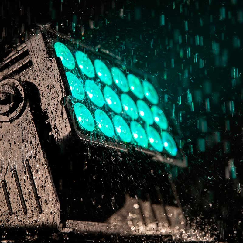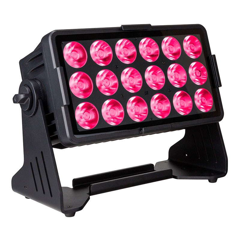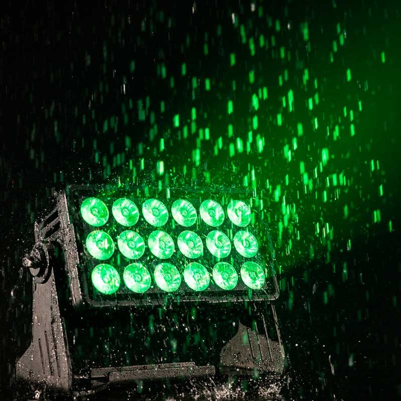 PROYECTOR BT-COLORAY 18FCR 18 LED 8WProyector para exterior con 18 LED RGBW de 8W, ángulo de haz de 20° y conectores Neutrik TRUE1 Powercon y 3P XLR y refrigeración por ventilador IP. Clasificación IP65. Tres modos DMX diferentes: 4, 6 y 7 canales.