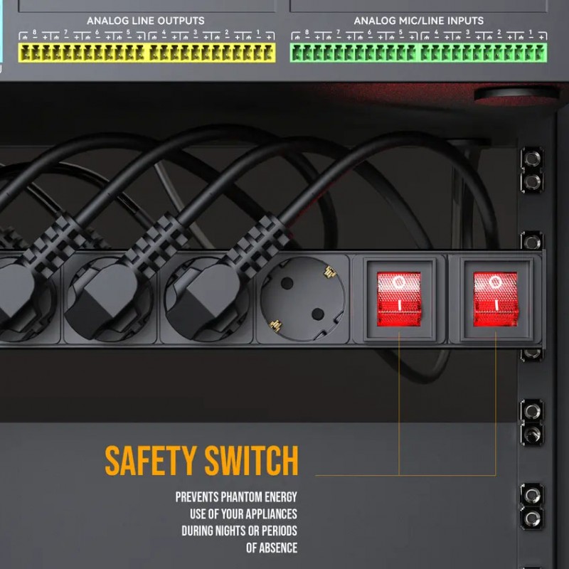 Base 8 Schuko formato Rack 19" 1U con Interruptor On/Off | Audibax PSR8-PwCPotencia maxima 3.680 W. Longitud del cable: 1,8 m Entrada de alimentación mediante conector powerCON 8 enchufes tipo Schuko de 16A. Interruptor On/Off en el frente Cuerpo de aluminio Altura de rack 1U. Cable de alimentación H05VVF de 3x1,5mm² y de 1,8 metros de longitud, con...