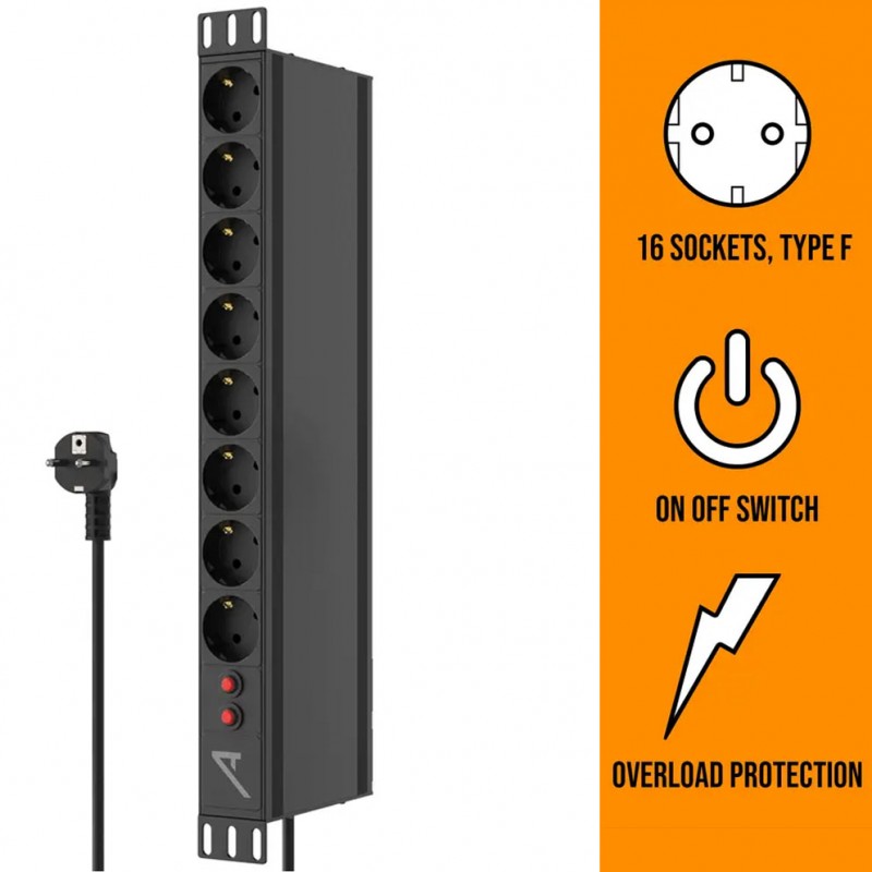 Regleta 8 Tomas Schuko para Armario Rack 19" 1U con Interruptor On/Off | Audibax PSR8-SFPotencia maxima 3.680 W. Longitud del cable: 1,8 m 8 enchufes tipo Schuco de 16A. Interruptor On/Off delantero Cuerpo de aluminio. Altura de rack 1U. Cable de alimentación H05VVF de 3x1,5mm² y de 1,8 metros de longitud, con conector schuco de 16A Cumple la normativa...
