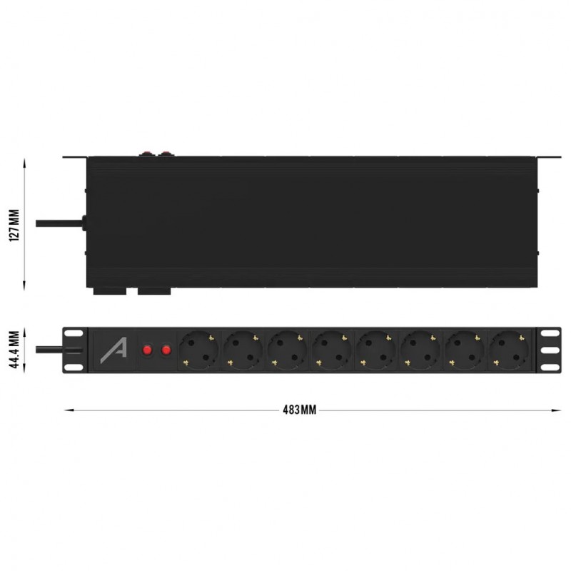 Regleta 8 Tomas Schuko formato Rack 19" 1U | Audibax PSR8-SBPotencia maxima 3.680 W. Longitud del cable: 1,8 m 8 enchufes tipo Schuco de 16A. Cuerpo de aluminio. Altura de rack 1U. Cable de alimentación H05VVF de 3x1,5mm² y de 1,8 metros de longitud, con conector schuco de 16A Cumple la normativa 89/366/EEC - 73/23/ECC - 93/68/EEC con estándares norma...