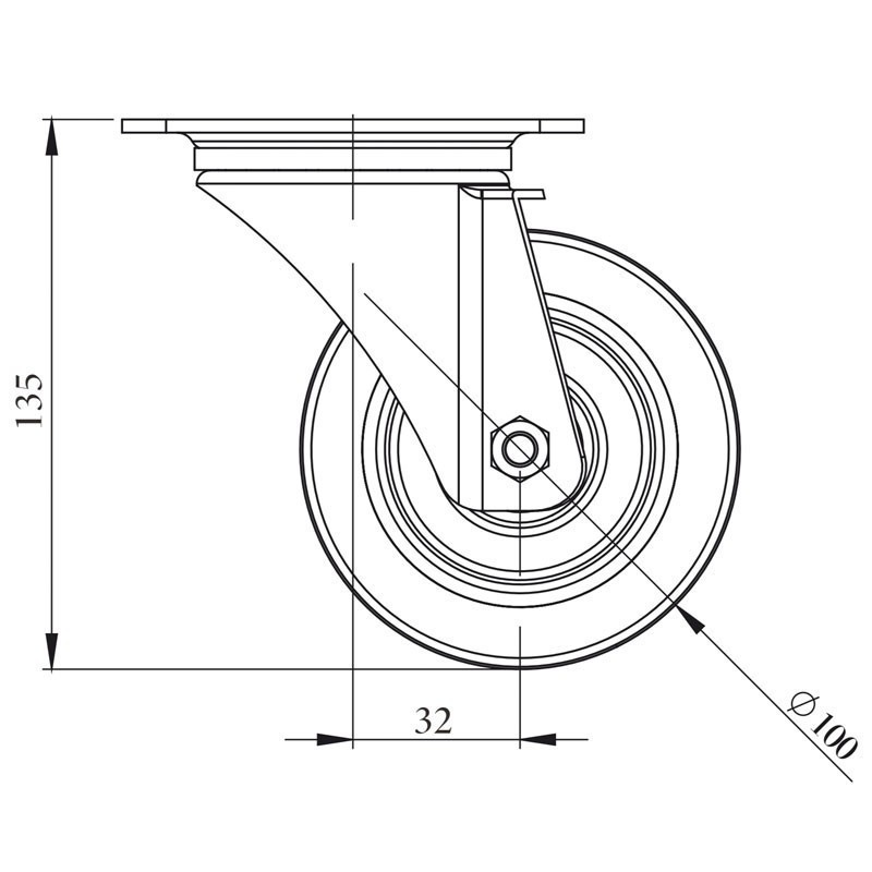 Rueda giratoria de 100mm color azul SIN PEDAL DE FRENORueda giratoria de 100 mm Sin freno Rodamiento mediante bolas dobles de 2,4mm. Marco de acero zincado Neumático de la goma de color azul. Altura 125 mm Capacidad de carga (con 4 ruedas): 450 kg Peso: 0,73 kg