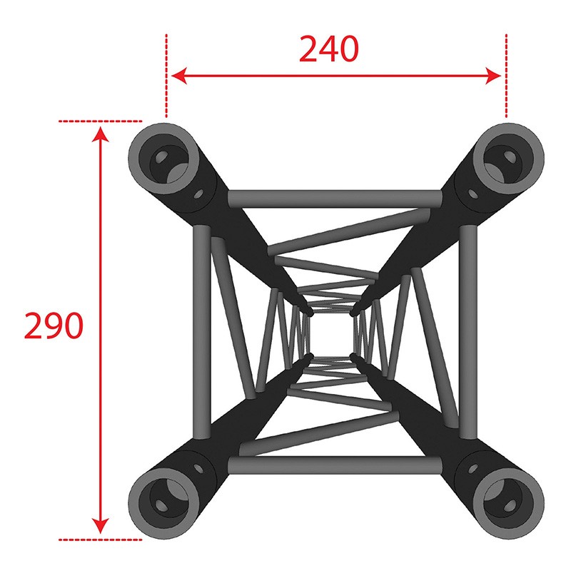 TRUSS AGQUA-06 COLOR NEGRO Pieza truss de aluminio tramo intermedio de 4 direccionesFabricación según la norma DIN ISO 4113 y las normas TUV. Aleación de aluminio (EN AW 6082 T6) de 50 mm de diámetro y 2 mm de espesor. Soportar cargas más grandes se monta con accesorios cónicos. Compatible con la marca Prolyte.