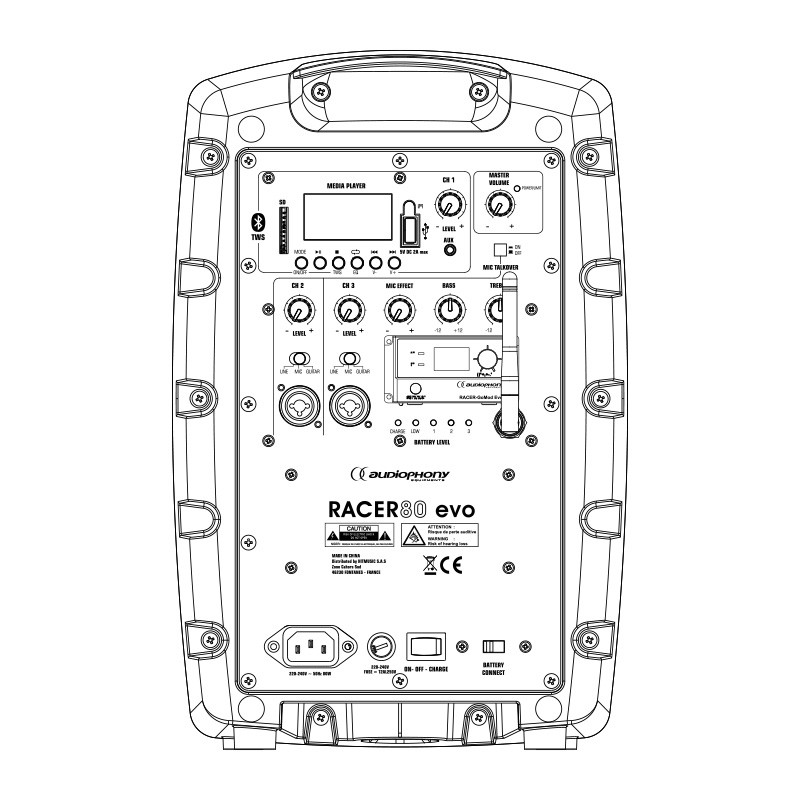 Altavoz con bateria de 250W RACER250 | AudiophonyUn sistema todo en uno fácil de transportar Rendimiento y calidad de sonido Reproductor multimedia integrado Dos ranuras para receptores diversity UHF Se suministra con 2 antenas (RACER-GoAnt) No incluye receptor (RACER-GoMod Evo) No incluye micrófono GO-Hand