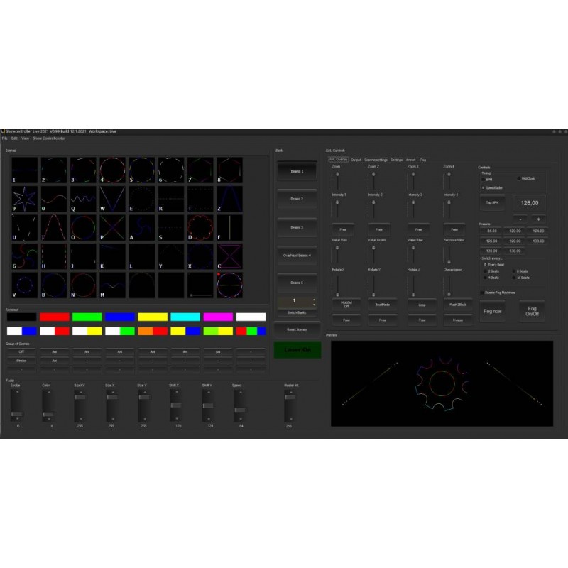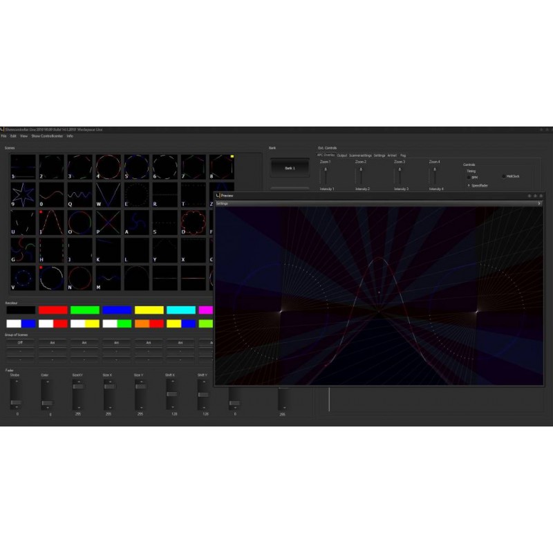 Showcontroller LIVE es una herramienta extremadamente potente: se pueden preprogramar 40 escenas por banco, en 10 bancos. Showcontroller LIVE también incluye una amplia colección de escenas predefinidas. Esto permite iniciar un espectáculo láser en vivo de inmediato.
