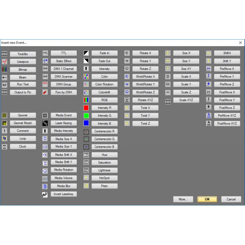 Versión PLUS con eventos multimedia, hasta 20 DAC (16 canales de contenido individuales), compatibilidad con Realizzer, Capture y Depence2, y exportación de archivos ILDA.