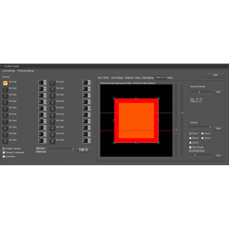 Esto abarca toda la gama, desde interfaces USB sencillas hasta interfaces LAN de gama alta. Todas las interfaces admiten entrada/salida DMX. Showcontroller PLUS cuenta con una ventana de vista previa más grande en LIVE, donde se puede visualizar la salida de todos los escáneres. Showcontroller PLUS también es compatible con el software de visualización 3D REALIZZER y el uso de eventos de vídeo.