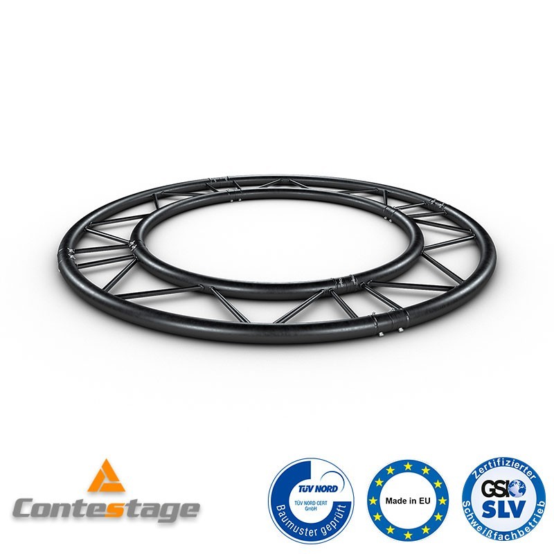 Truss de aluminio circular para montaje en vertical de 3 m de diametro. Color negroSerie DUO29 de Contest Modelo: CDUOv29-300 BLK Se suministra en 4 partes Diametro: 3 metros Fabricado en tubo de aluminio Ø 3 mm Material: Aluminio Color: Negro
