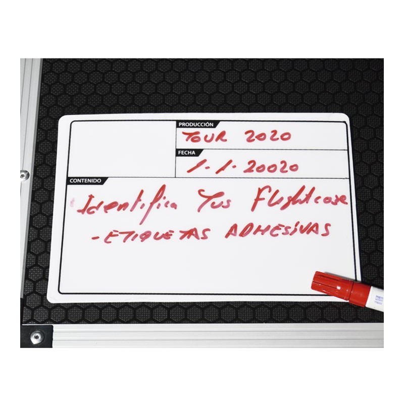 Etiqueta Adhesiva para Flightcase de 220 x 150 mm.Identifica tus Flighcase de una forma fácil, duradera y económica, gracias a esta Etiqueta Autoadhesiva de 220 x 150 mm. (disponible en otros tamaños), de color blanco y superficie con lámina transparente Se puede limpiar y reutilizar con facilidad, sin decolorarse.